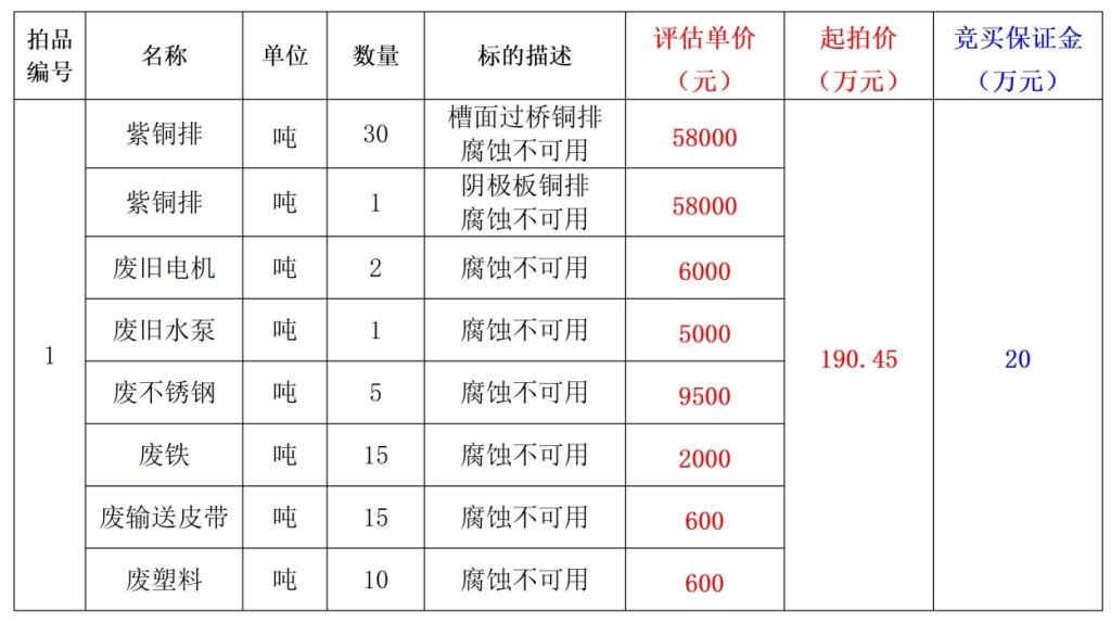 紫銅排、廢舊電機(jī)、廢舊水泵、廢不銹鋼、廢鐵、廢運輸皮帶、廢塑料等一批廢舊物資。
