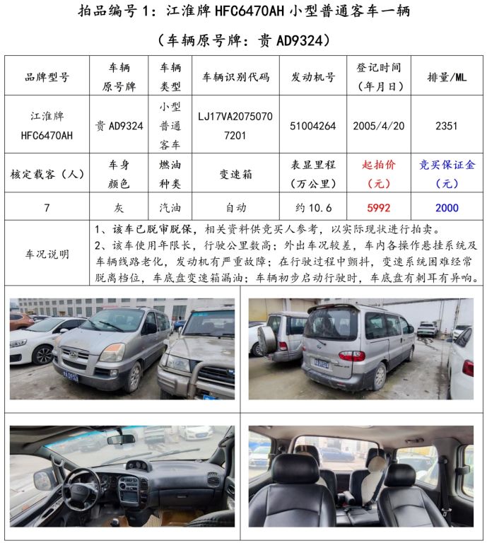 拍品編號1:江淮牌HFC6470AH小型普通客車一輛(車輛原號牌:貴AD9324);