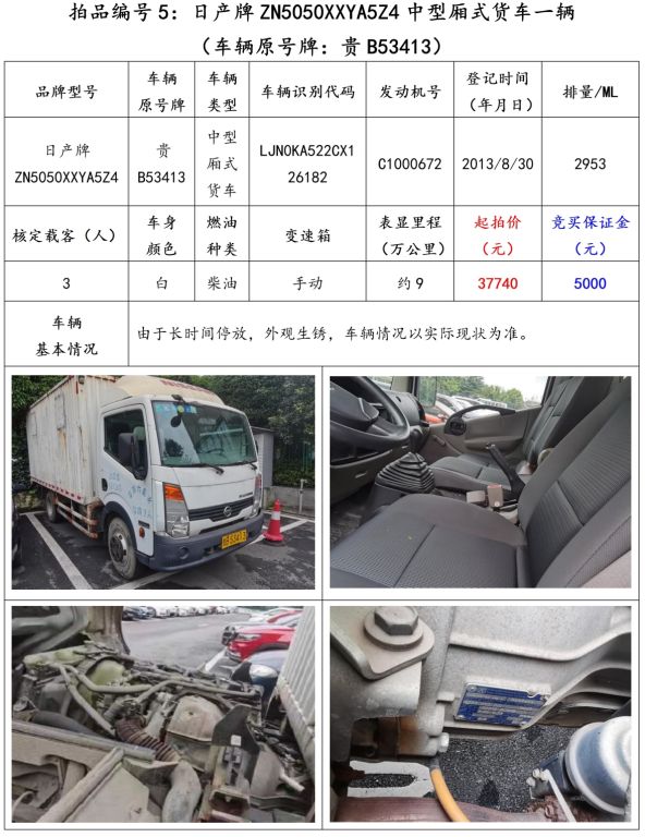 拍品編號5:日產牌ZN5050XXYA5Z4中型廂式貨車一輛(車輛原號牌:貴B53413);