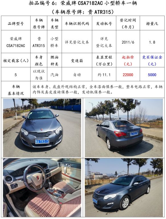 拍品編號6:榮威牌CSA7182AC小型轎車一輛(車輛原號牌:貴ATR315);