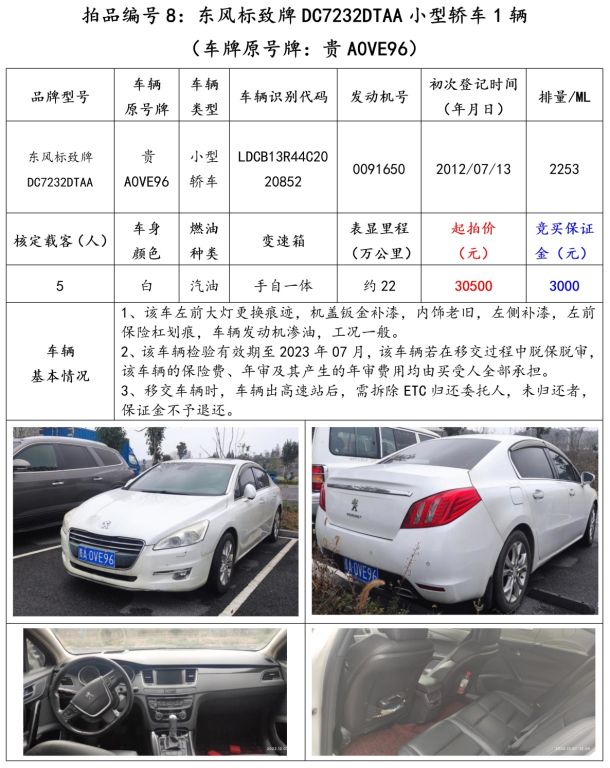 拍品編號8:東風標致牌DC7232DTAA小型轎車1輛(車牌原號牌:貴A0VE96);