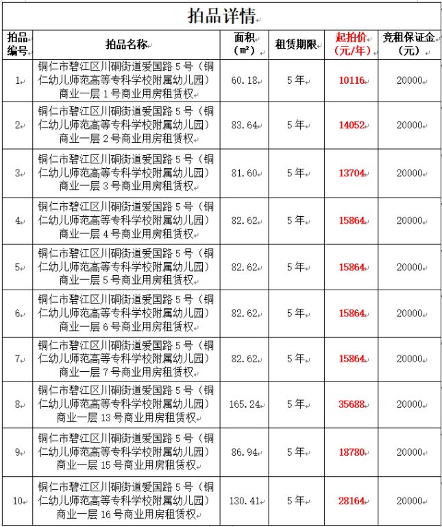 10、銅仁市碧江區川硐街道愛國路5號(銅仁幼兒師范高等專科學校附屬幼兒園)商業一層16號商業用房租賃權,面積130.41㎡,租賃期限5年,起拍價:28164元/年,競租保證金:2萬元。