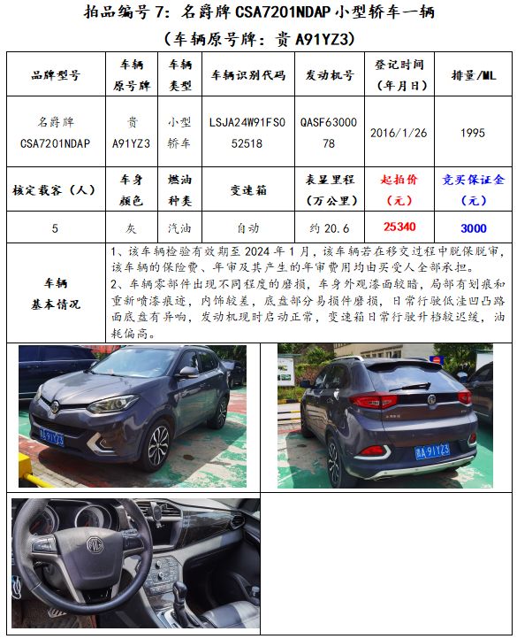 拍品編號7:名爵牌CSA7201NDAP小型轎車一輛(車輛原號牌:貴A91YZ3);